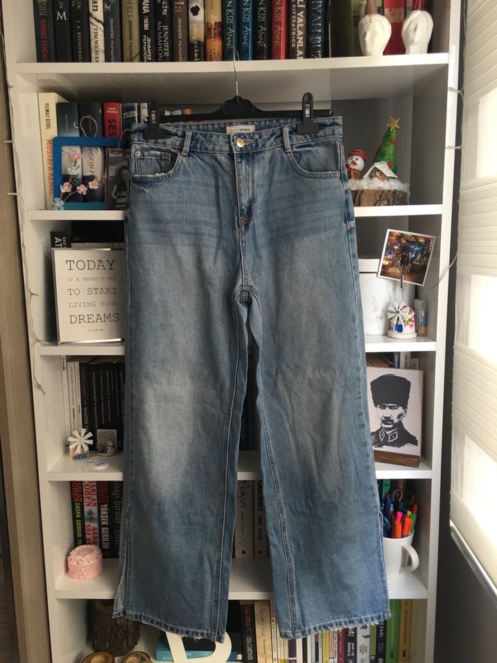 denim kumaştan yapılmış, bol kesim kadın kot pantolon. Günlük giyim