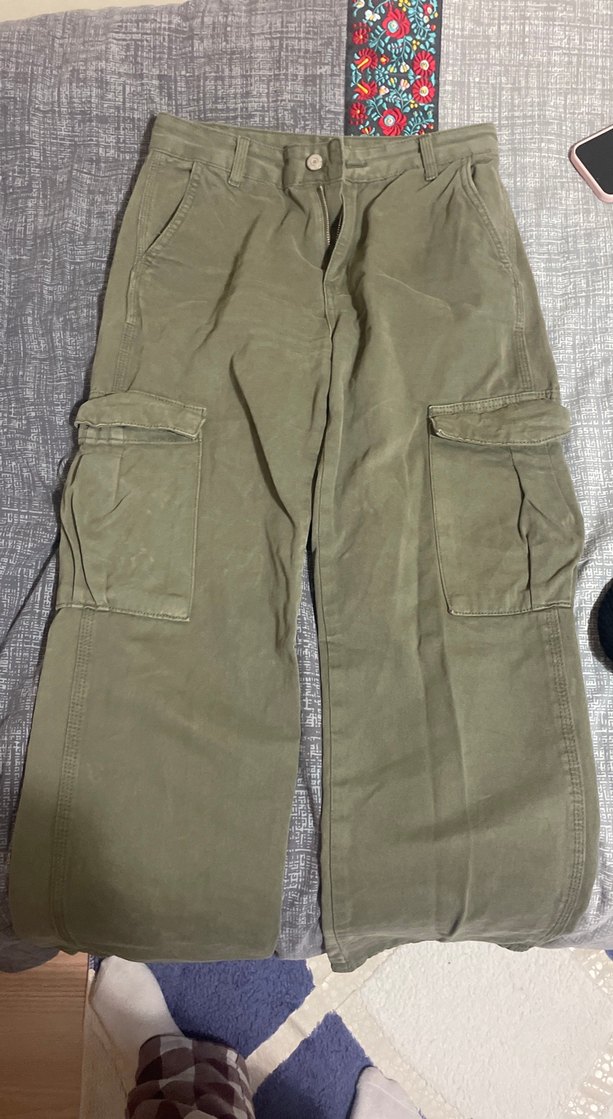 Kemerli, bol kesim kargo pantalon , cep detaylı khaki kadın pantolon, günlük rahat kullanım için uygundur.