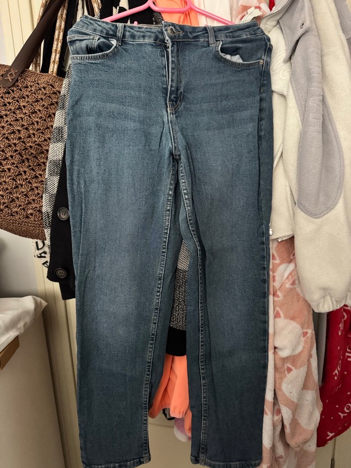 Bol kesim, kemerli, normal boyda mavi kot pantolon, günlük rahat stil için uygundur.