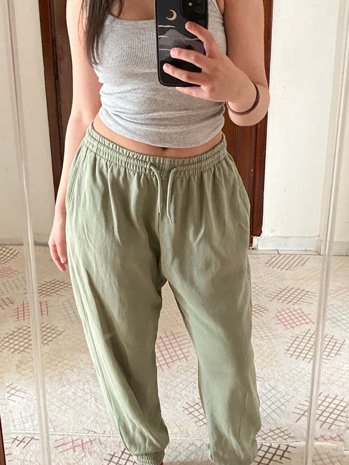 Yumuşak keten kumaştan, bol kesim, midi boy, günlük kullanıma uygun, rahat ve şık khaki renk kadın pantolon.