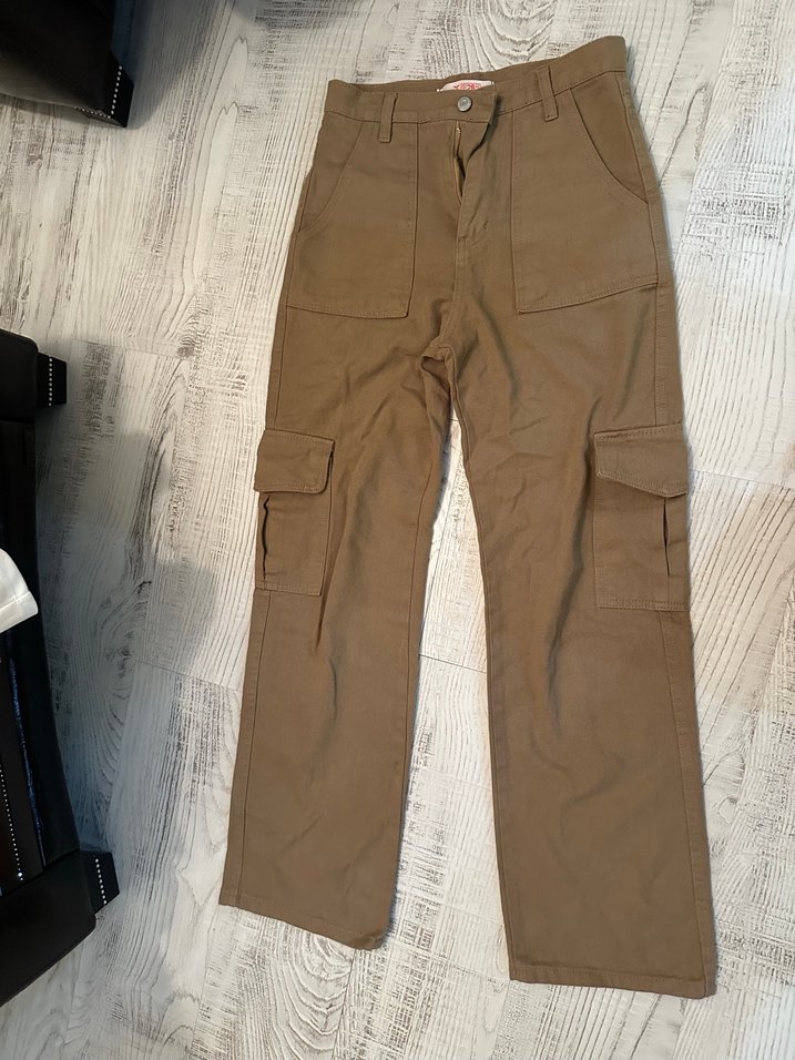 bol kesim, kemerli keten kumaştan yapılmış kahverengi pantolon. Sokak stiline uygun, desen içermeyen ve kullanışlı yan ceplidir.
