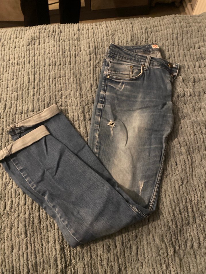 Bol kesim, normal boyda kot pantolon. Tokalı detayı ve desensiz gri rengiyle günlük kullanıma uygun.