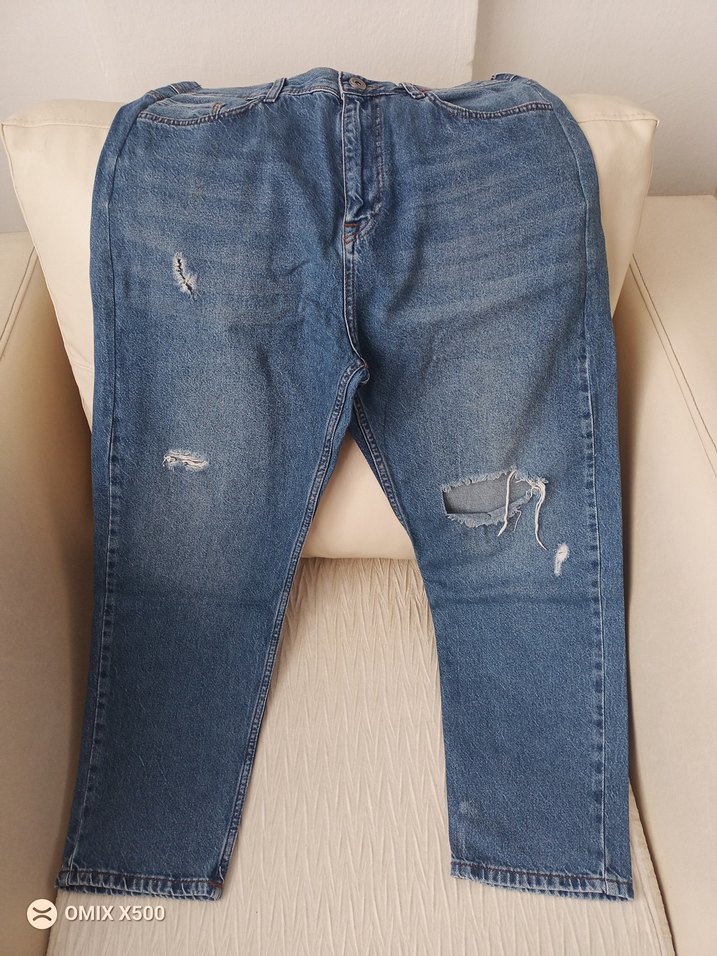 bol kesim, tokalı ve yırtık detaylı mavi kot pantolon. günlük rahat ve sokak stili için uygun.