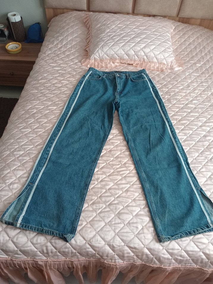 Bol kesim, mavi midi uzunlukta denim pantolon. Yanlarda yırtmaç ve hafif batik desenlidir, günlük kullanım için uygundur.