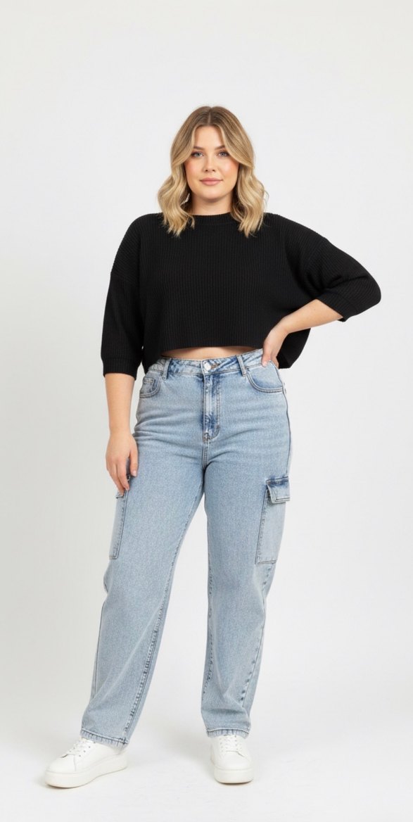 Bol kesim midi uzunlukta, açık mavi renkte denim kadın jean. Rahat ve günlük kullanıma uygun yan ceplerle sokak stilini yansıtıyor.