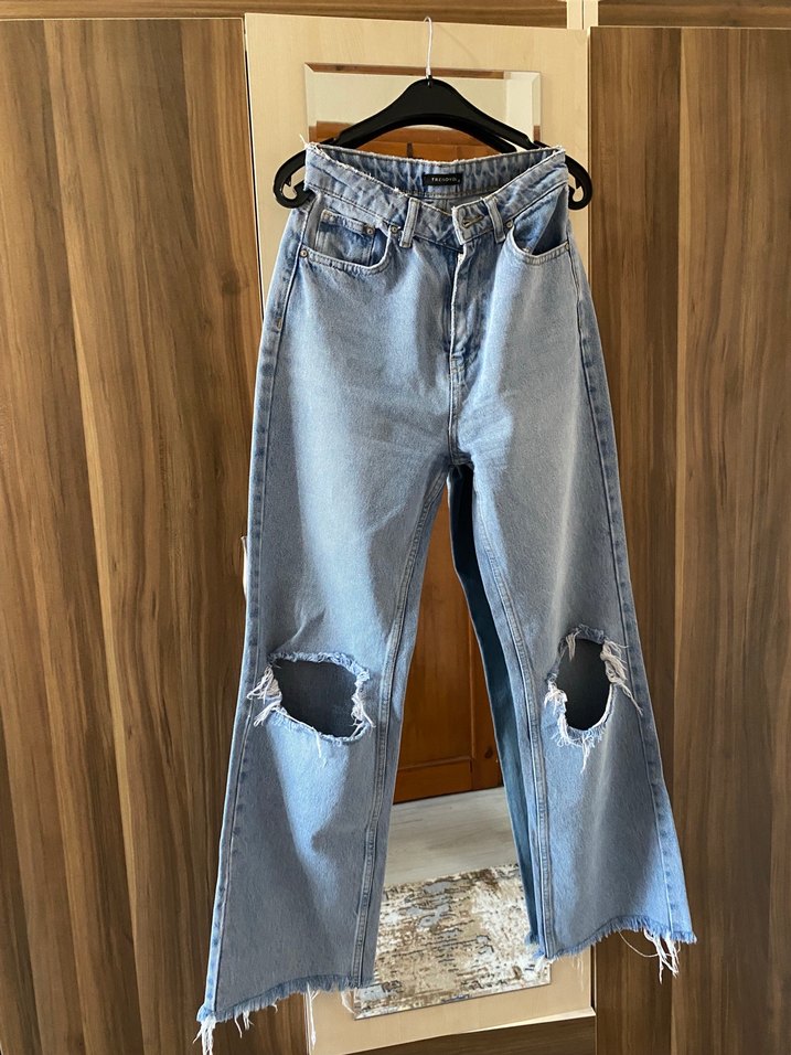 Bol kesim, midi boy kadın kot pantolon. Dizlerinde yırtık detayları ve tokalı bel tasarımı bulunur. Mavi-gri renkte, günlük rahat sokak stili için uygun.Bel 32cm. İç bacak uzunluk 72 cm.