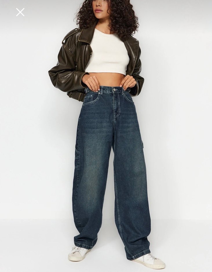 Bol kesim midi kot pantolon, kemerli bel detayıyla dikkat çekiyor. Normal boyda ve günlük kullanıma uygun rahat bir sokak stili sunar.