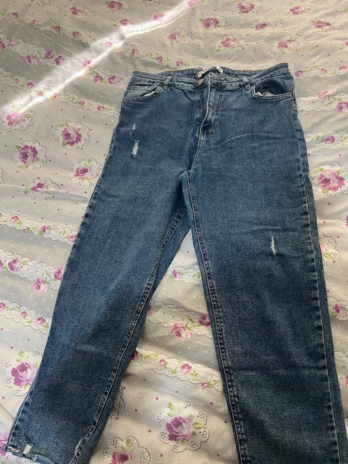 Kot kumaştan, bol kesim ve midi boyda, tokalı detaylı kot pantolon. Mavi-gri renk ve günlük sokak stili için uygundur.