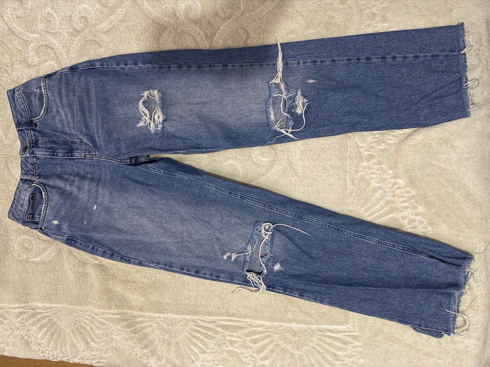 Zincir detaylı, yırtık desenli bol kesim midi uzunluğunda mavi-gri kot pantolon. Casual stil için uygundur.