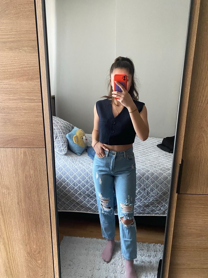 Lacivert batik desenli, bol kesim midi uzunlukta kot pantolon. Rahat kesimi ve gündelik kullanıma uygun tarzıyla öne çıkar. Kalıbı büyüktür