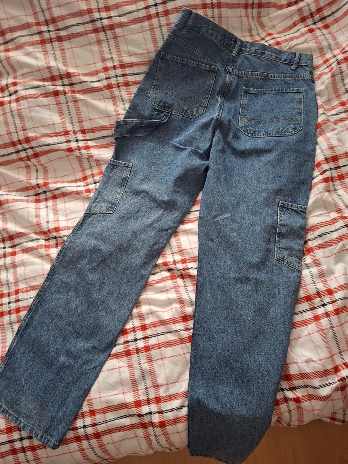 Bol kesim, normal boy midi mavi denim kadın kot pantolon, tokalı detaylara sahip. Rahat ve günlük sokak stili için uygun.