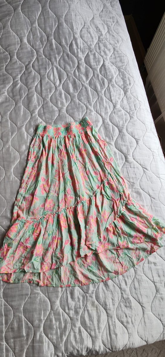 Bol kesim, fırfırlı detaylı uzun etek. Pastel renkli batik desenli, yumuşak sentetik kumaştan, günlük kullanıma uygun bohem tarz.