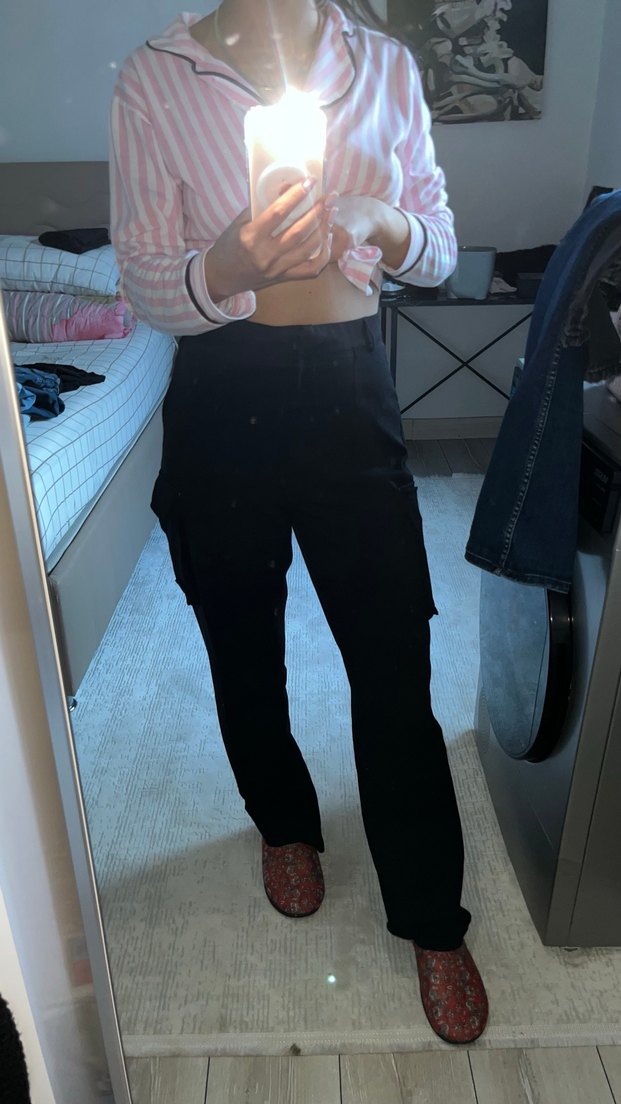 Bol kesim siyah hamile kot pantolon, toka detaylı, rahat ve gündelik sokak tarzı için uygundur.