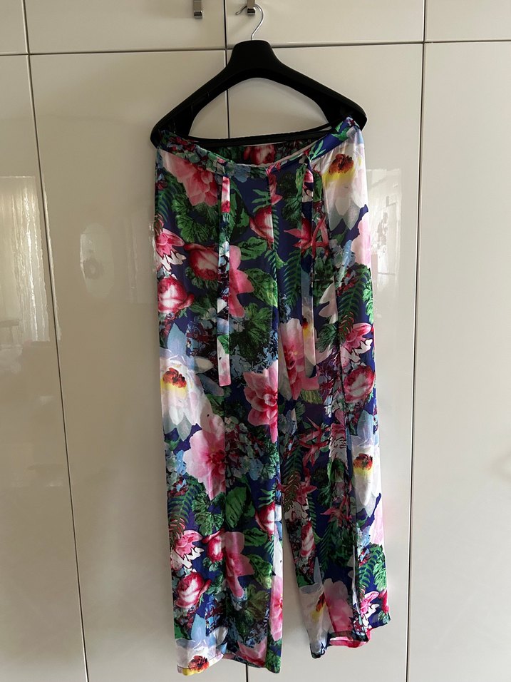 Bol kesim, uzun, çok renkli tie-dye desenli ve drapeli bohem tarzı pantolon. Yumuşak sentetik kumaştan, günlük kullanıma uygun.