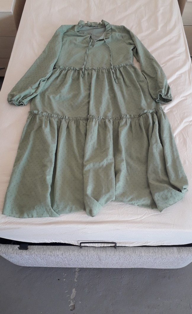 2 kere giydim. Kolunda astar yok ama içi pek göstermiyor. Elbise kısmı astarlı. Xs-S uyumlu. Boyu 155 boyda diz kapağından 1.5 karış uzun
