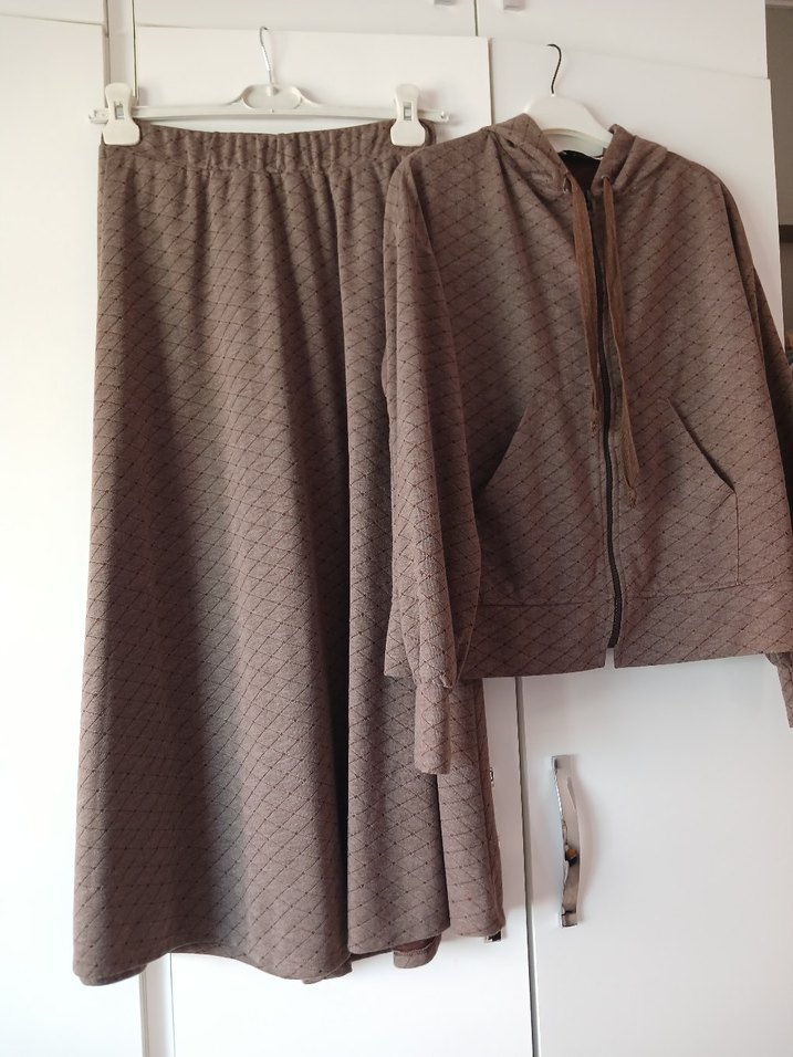 Yumuşak sentetik kumaştan, kahverengi bol kesim uzun eteği, drapeli tasarımıyla günlük kullanım için rahatlık sağlar.