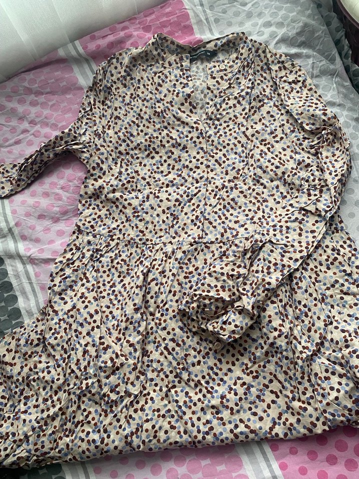 Uzun kollu, V yakalı, düğmeli ön kısmı olan bol kesim hamile tunik. Pastel çok renkli batik desenli, yumuşak sentetik kumaştan, bohem tarzında.