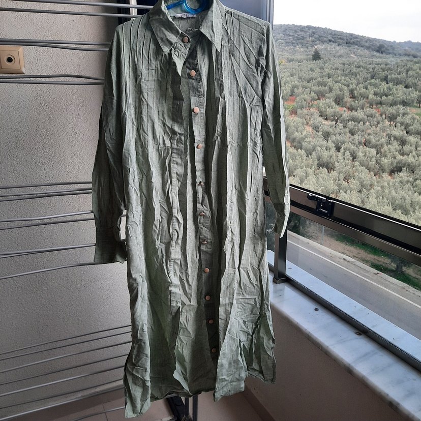 Bol kesim, uzun keten ceket, düğmeli ve kesik yakalı, gündelik bohem tarzda kullanıma uygun.