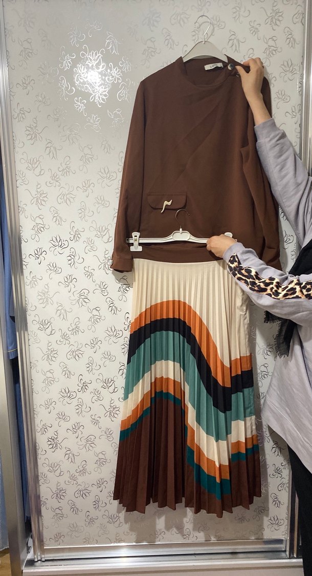 Armine kahverengı pliseli etek gömlek takım