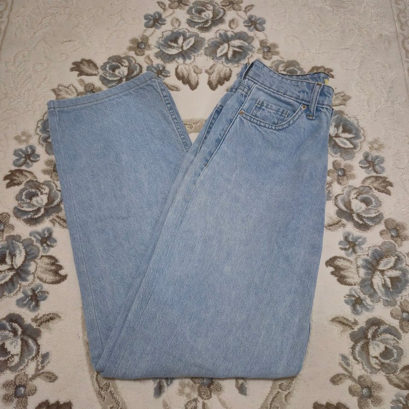 Düğmeli ön kısmı ve rahat kesimiyle mavi denim kot pantolon. Normal boyda, pastel tonlarda, günlük kullanıma uygun normcore tarzda.