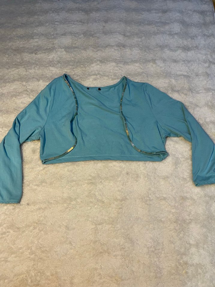 Parlak mavi renkte, uzun kollu, yumuşak ve sıcak kumaştan yapılmış kız bolero. Trend görünüme uygundur.
