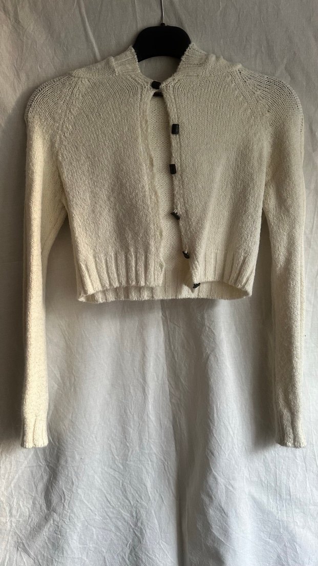 Düğmeli, uzun kollu, yuvarlak yaka ve orta boy uzunlukta, yumuşak dokulu beyaz kadın kazak. Bohem tarzıyla rahat bir görünüm sunar.