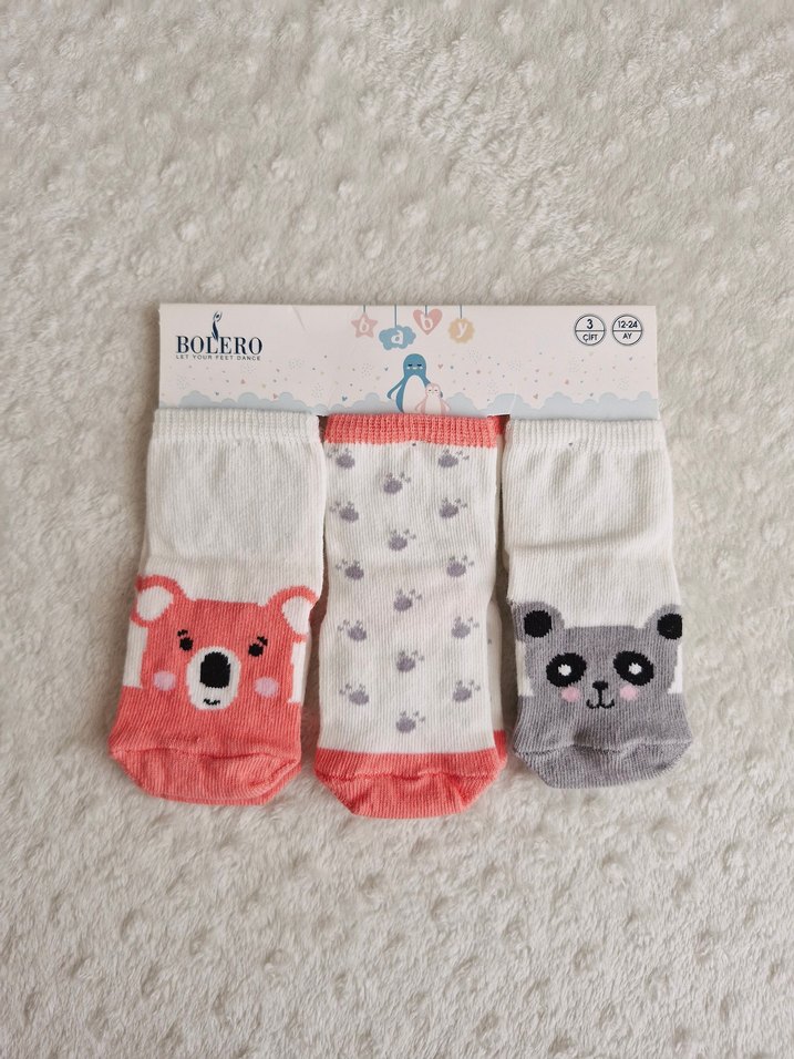 Bolero markalı kız çocuk çorap seti, yumuşak ve sıcak kumaşta üç çift hayvan desenli çoraptan oluşur. Renkler gri ve çok renklidir.