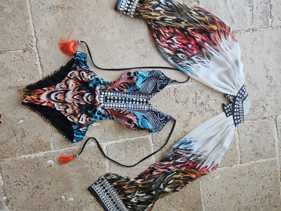 Renkli tie-dye desenli, püsküllü detaylara ve askılı uzun kollara sahip, vücuda oturan kadın monokini. Plaj için uygun.