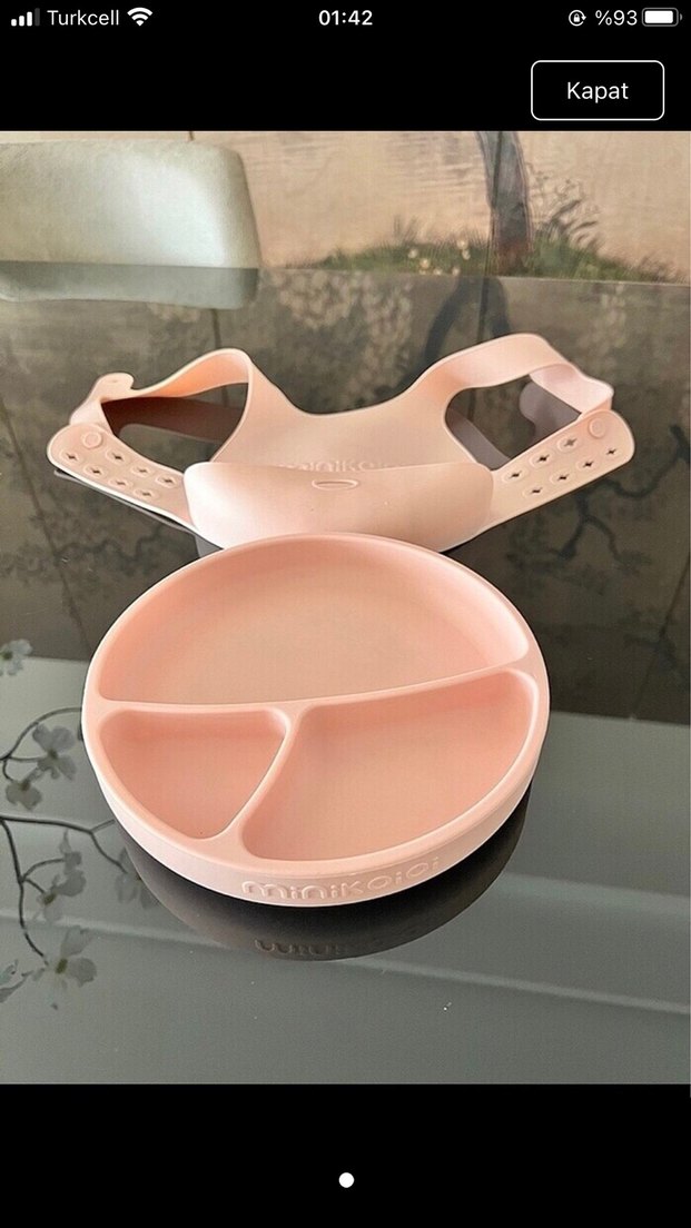 Pastel pembe renkli çocuk tabak seti, yiyecekleri ayırmak için bölmeli tasarıma sahiptir ve ayarlanabilir önlük ile birlikte gelir. ️