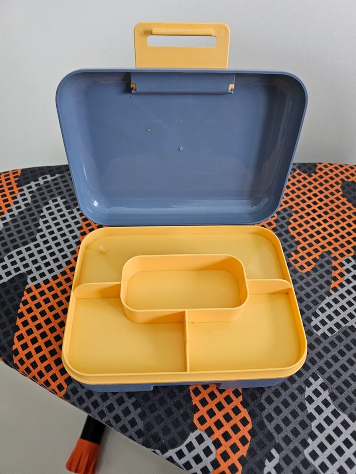Sarı renkli, birden fazla bölmesi olan çok amaçlı beslenme kutusu temiz kız yada erkek çocuk farketmez
