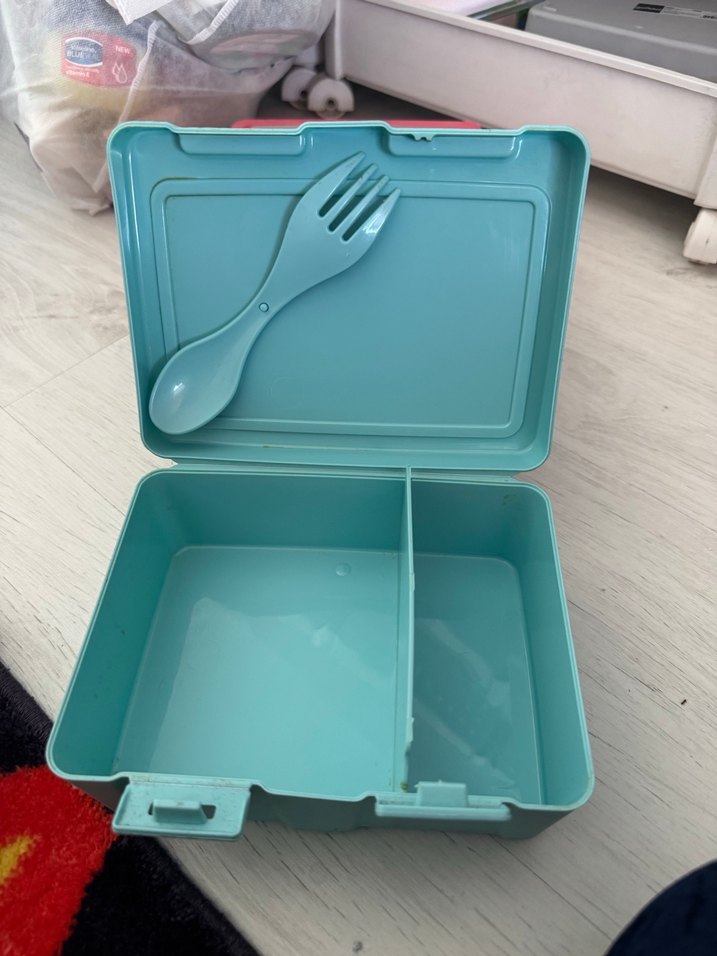 Turkuaz renkli, bölmeli yemek kabı ve uyumlu çatal kaşık içerir. Dayanıklı plastikten yapılmış, güvenli kapanma sağlar.