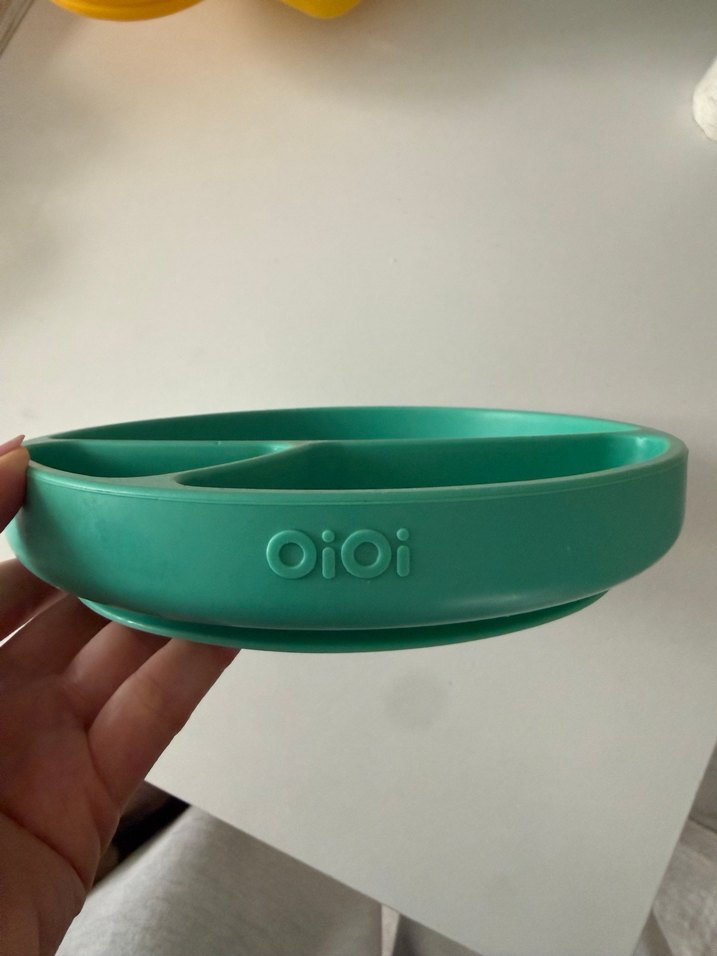 Markası 'oi oi' olan, koyu yeşil renkte, bölmeli ve dayanıklı malzemeden yapılmış çocuk tabağı. ️