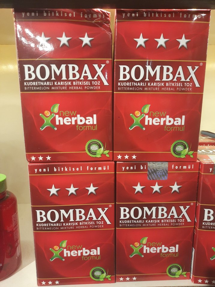 Bombax, kırmızı renkte kudretnarlı ve acı kavun karışımı bitkisel toz, yeni bitkisel formül ile hazırlanmıştır.