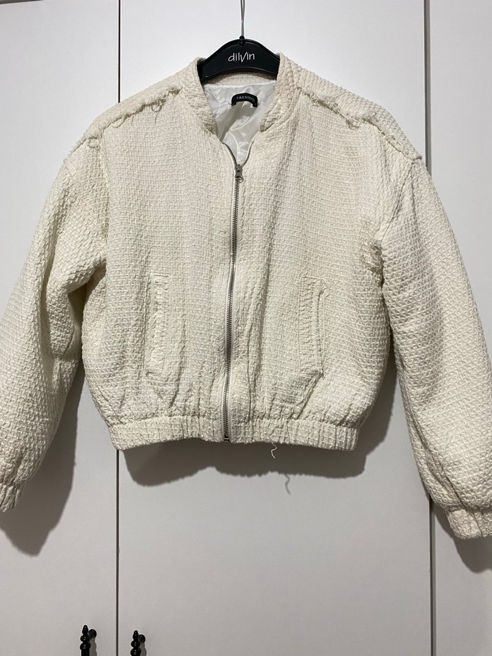 Düğmeli, uzun kollu, yuvarlak yakalı, bol kesim bej ceket. Hem spor hem günlük kullanıma uygundur. Sadece 1 kez giyildi ürün temiz hiçbir deformesi yoktur.