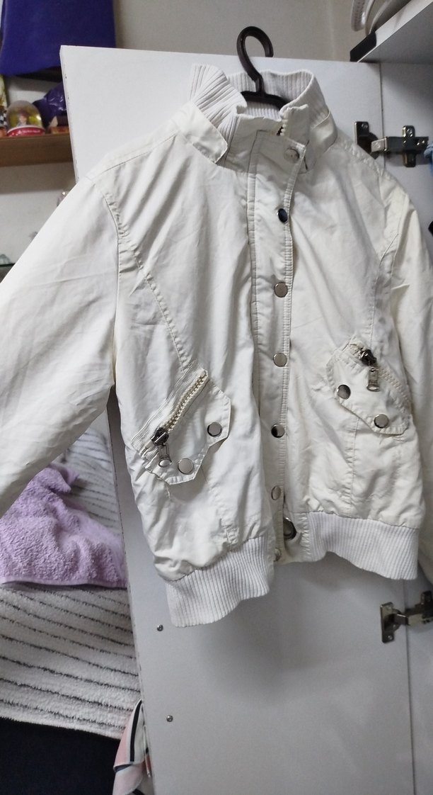 Uzun kollu, düğmeli beyaz pamuk ceket. Kısa boy ve cep fermuarlarıyla günlük sokak stiline uygun rahat kesim.y2k ve vintage sayılabilir herhangi bir kusuru yok