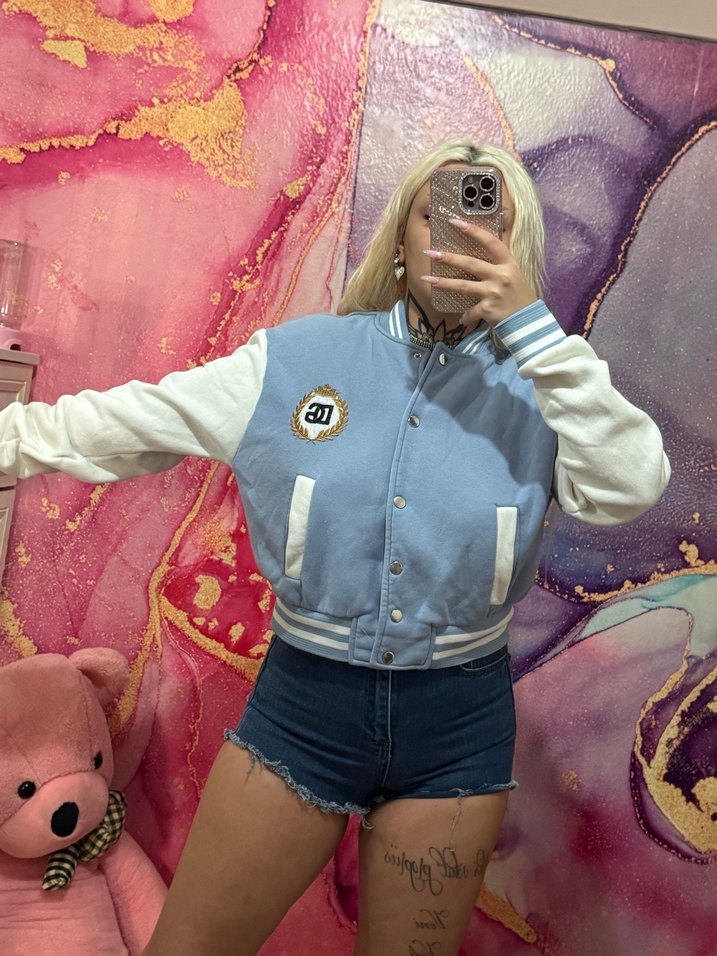Bu dar kesim kadın bomber ceket, uzun kollu ve düğmeli ön yapıya sahiptir. Denim malzemeden, pastel mavi renkte ve bağlama desenli olup, straplez yaka ile parti için uygundur.