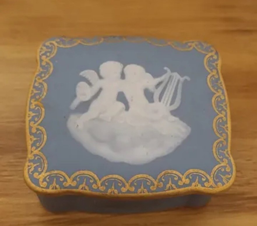 Wedgwood görünümlü Limoges bonbonier. Altın detaylı, kapağında iki meleğin müzik aleti çaldığı beyaz figür bulunan pastel renkli kutu.