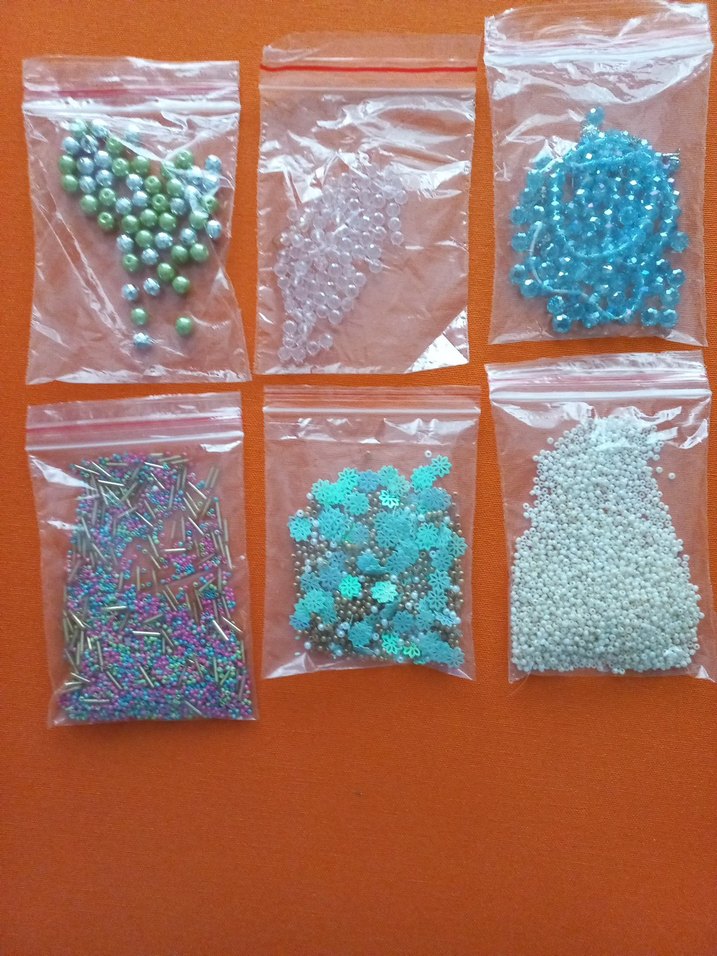 Farklı şekil ve renkte boncuk ve küçük parçalar içeren bohem tarzı el işi seti. Mavi, yeşil, beyaz ve parlak tonlarda yuvarlak, küçük ve cam ve plastik boncuklar bulunur.