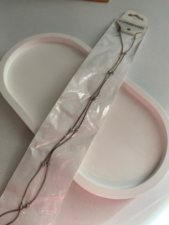 Bej bohem tarzda, zincir detaylı ve boncuklu kadın kolyesi. Minimalist ve modaya uygun, romantik akşamlar için ideal, midi uzunlukta ve gri tonlarında.