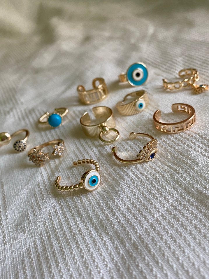 Boncuk ve nakış detaylı, altın renkli bohem tarzda kadın yüzükleri. Günlük kullanıma uygun, hafif ve detaylı tasarım.
