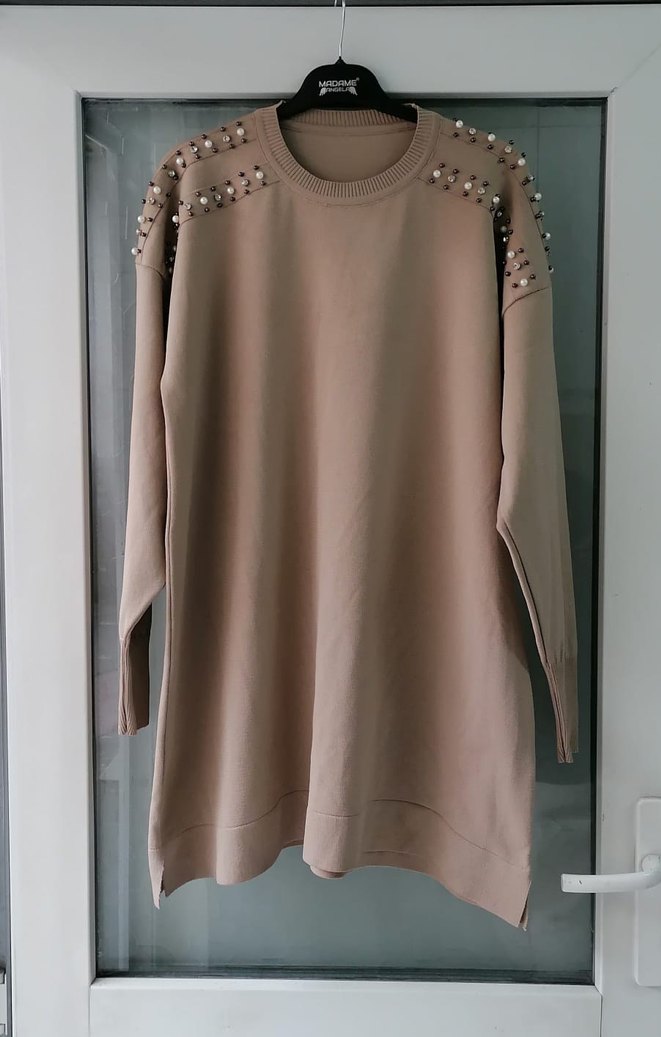 Bej renkte, boncuk detaylı omuzları süsleyen, uzun kollu ve yuvarlak yakalı triko tunik. Rahat kesim ve uzun boy, günlük kullanıma uygun. 42 ve 44 beden uyumlu likralı esnek triko kesinlikle tüylenme yapmayan kumaş