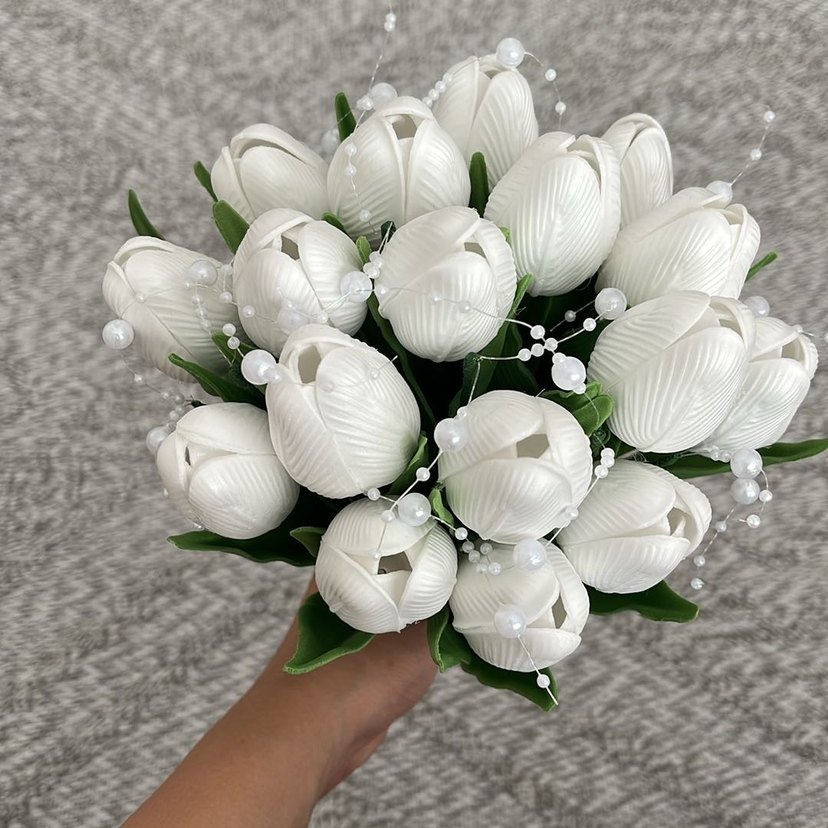 17 adet lale gelin çiçeği. 1 adet damat yaka çiçeği ile birlikte gönderilecek Boncuk detaylı beyaz bohem gelin buketi, yeşil yapraklarla minimalist ve avangart tarzı bir araya getiriyor.
