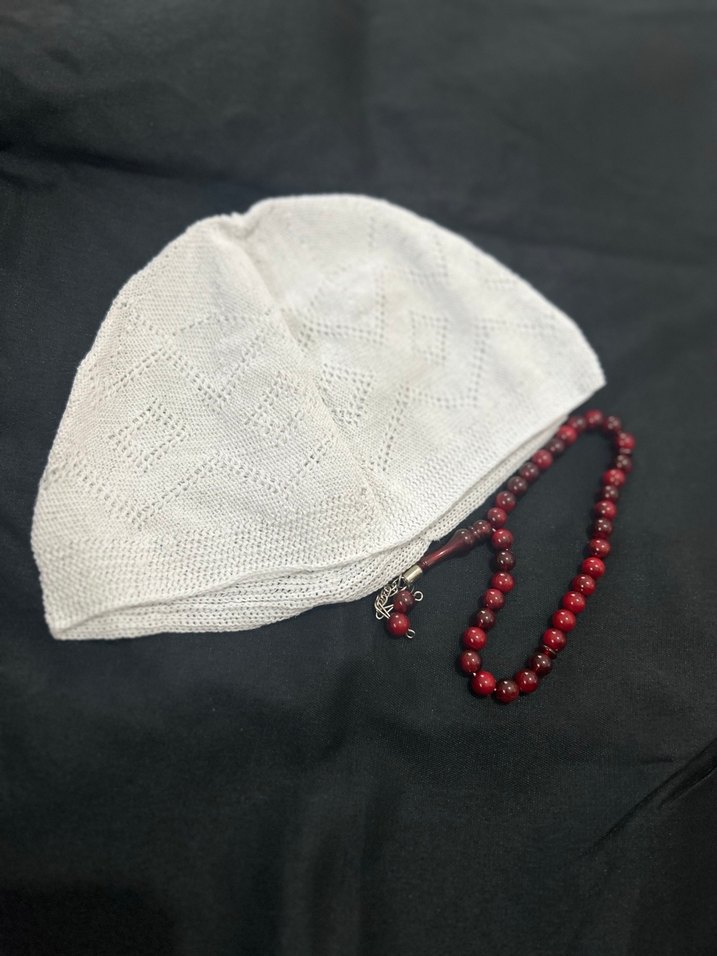 Boncuk detaylı, beyaz renkli örgü erkek namaz şapkası, sade ve mütevazı tasarıma sahip. Yanında tesbih de gönderilecektir