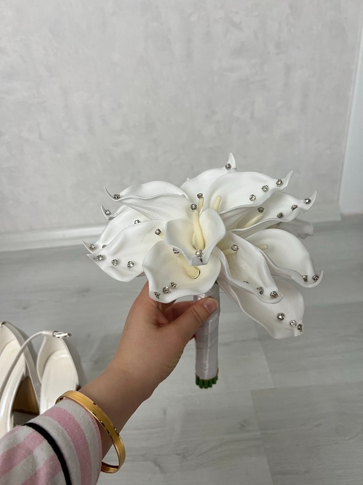 Boncuk detaylı beyaz gelin buketi, klasik zarafetle çağdaş avangart stili birleştirir.