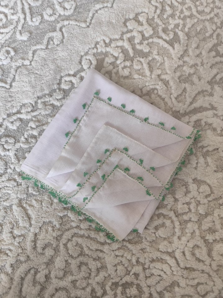 Beyaz kadın eşarp, yeşil boncuklarla süslenmiş, yumuşak dokulu tekstilden yapılmıştır, sade ve rahat bir stile sahiptir. Ufak bi lekesi vardır, belirttim