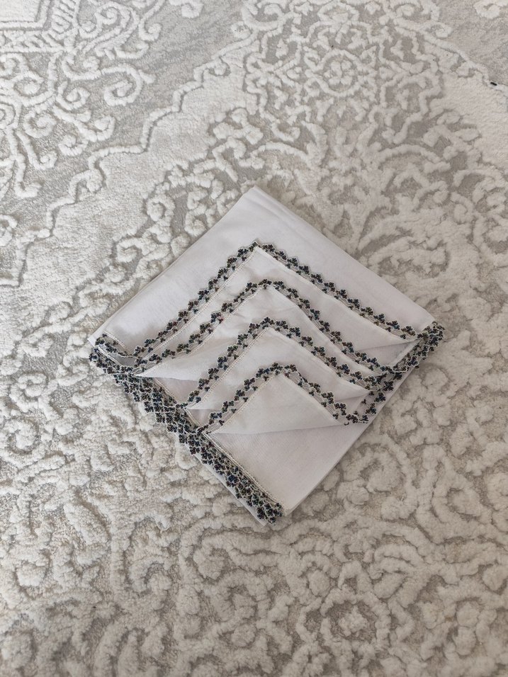 Beyaz kadın fular, kenarlarında boncuk detaylarıyla yumuşak tekstil malzemeden yapılmıştır. Bohem, hippie ve vintage tarzlara uygundur.