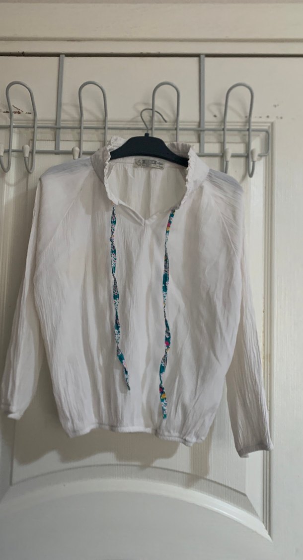Boncuk Detaylı Beyaz Keten Bohem Bluz