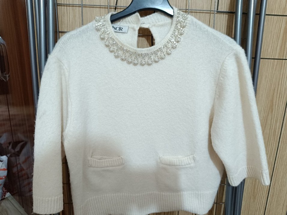 Boncuk işlemeli yuvarlak yaka, uzun kollu ve kısa kesim beyaz triko kazak. Önünde iki küçük cep bulunur, rahat ve günlük kullanıma uygun. ✨bı kaç kez giyildi sorusnsuz