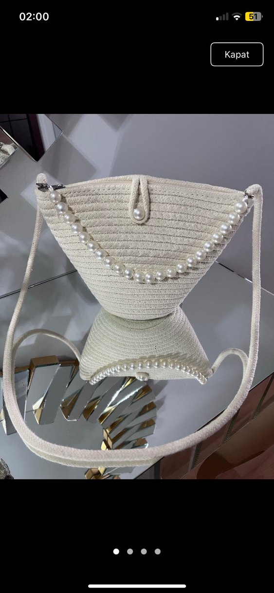 Boncuklu inci detayları ve nakışlı deseni olan beyaz örgü çanta, bohem tarzıyla günlük kullanım için uygundur. Marka temsili