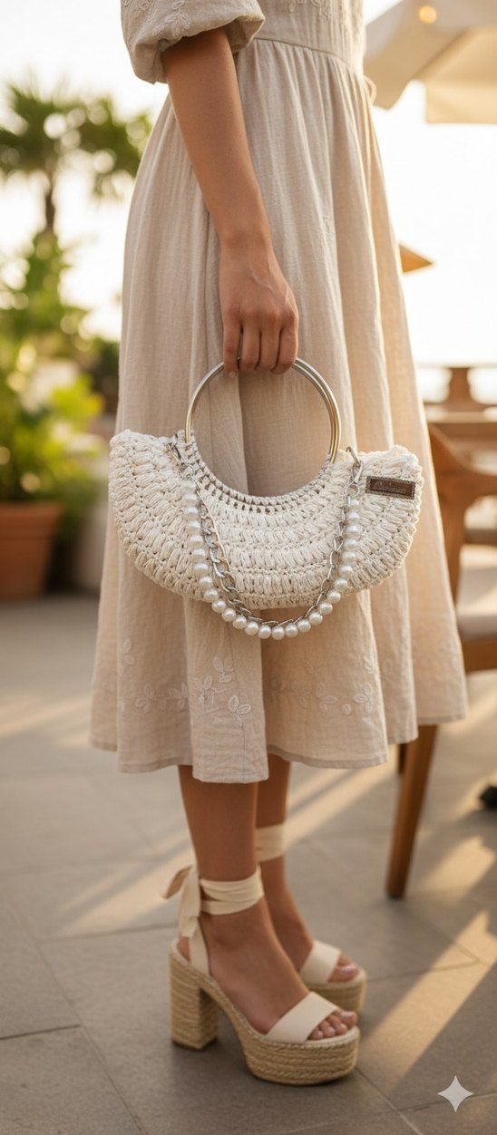 Beyaz örgü kumaştan yapılmış, nakışlı ve boncuk detaylı, metal halka saplı ve inci boncuklu zincir aksesuarıyla bohem tarzda çanta.
